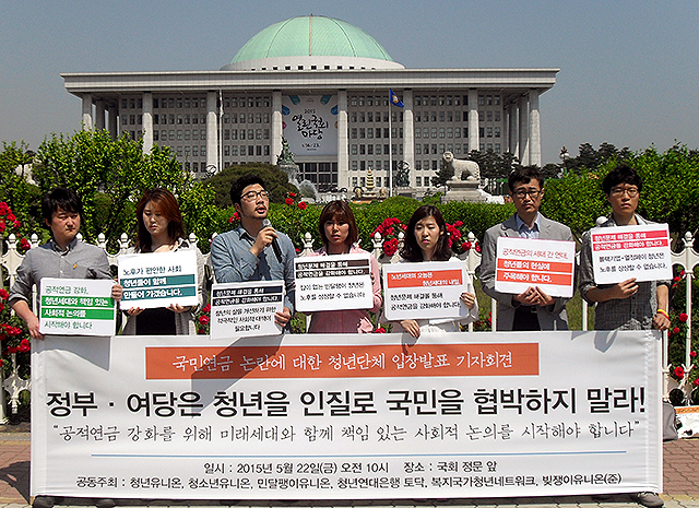 청년유니온, 민달팽이유니온, 청연연대은행 토닥 등 청년 단체는 22일 국회 정문 앞에서 기자 회견을 열고 "공적 연금 논의가 청년의 삶을 삭제한 채로 무책임하게 진행되는 것은 심각한 문제"라며 "청년을 인질로 삼아 공적 연금 강화를 위한 사회적 논의를 가로막는 정부, 여당을 규탄한다"고 밝혔다.
