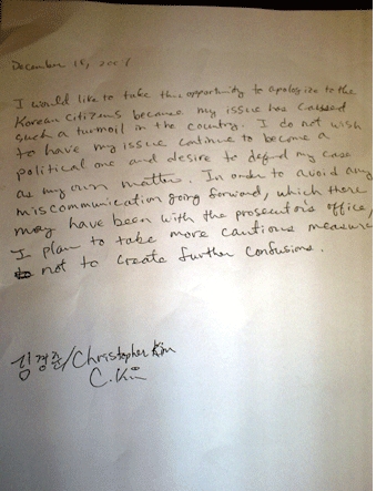 김 씨의 모친 김영애 씨는 이날 서울중앙지검 기자실에서 김 씨의 자필 편지를 공개했다. 영문으로 작성된 이 편지에서 김 씨는 "제 문제로 큰 소동(such a turmoil) 을 일으킨 데 대해 한국 국민께 사죄하는 기회를 갖고 싶다"면서 "저와 연관된 이슈가 계속 정치적인 문제가 되기를 원치 않으며 개인 문제(my own matter)로 다뤄지기를 바란다"고 말했다.