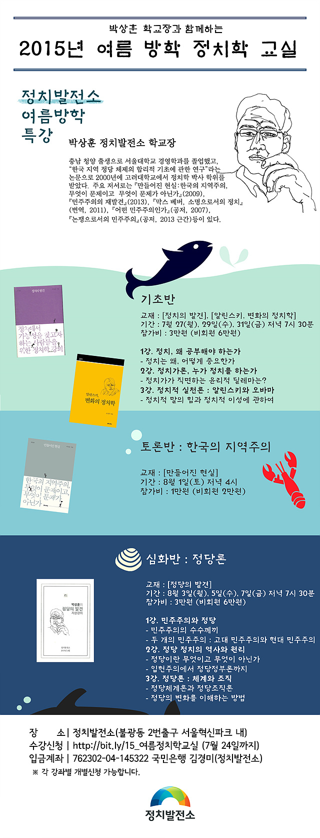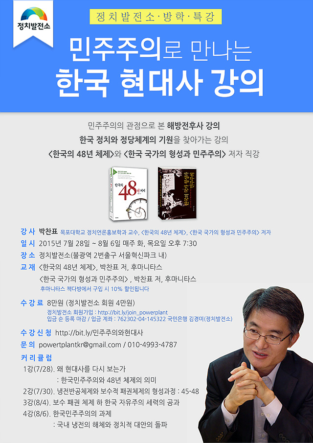 첫 번째는 정치발전소 박상훈 학교장이 진행하는 '2015 여름 방학 정치학 교실'입니다. 기초반과 토론반, 심화반이 준비되어 있습니다. 좋은 정치를 고민하신다면, 꼭 들어보세요. 각 강좌별로 개별 신청 가능합니다.