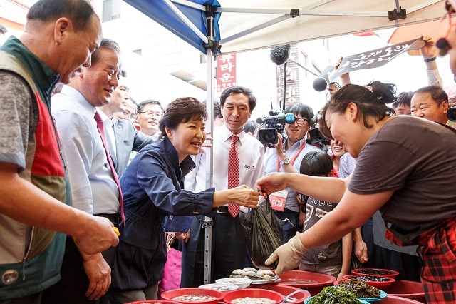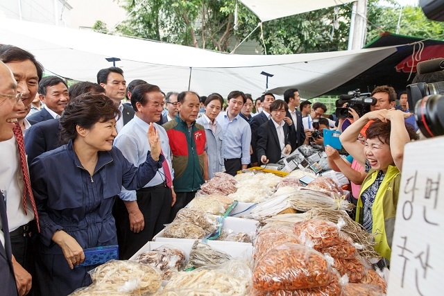 박 대통령은 이날 낙지, 술떡, 쑥떡, 포장된 족발 등을 구매했고, 건어물 상인으로부터 김을 선물로 받았다. 박 대통령은 "감사합니다. 이렇게 받아도 되는지"라고 말했다.