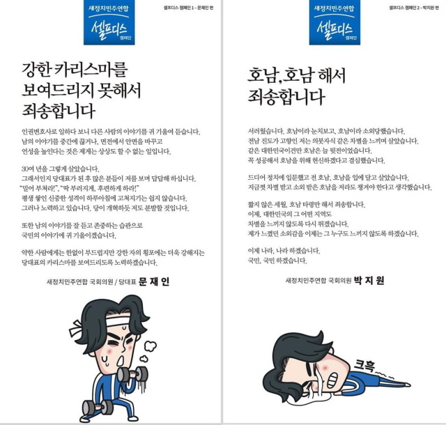 손 위원장은 먼저 지난 2.8 전당대회에서 맞붙었던 문재인 대표와 박지원 전 원내대표를 '셀프 디스' 캠페인의 1·2번 주자로 선정했다면서 "'필사즉생 필생즉사'의 새정치연합 혁신 의지를 보여주며 당에 계신 모든 분들로 범위를 넓힐 것"이라고 했다. 손 위원장이 직접 인터뷰하고 퇴고까지 한 것으로 알려진 두 사람의 '셀프 디스' 캠페인 내용은 아래와 같았다.