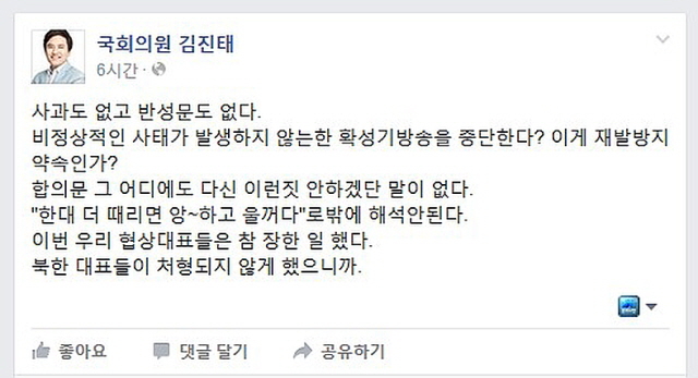 김 의원은 공동보도문 3항의 '남측은 비정상적인 사태가 발생하지 않는 한 군사분계선 일대에서 모든 확성기 방송을 8월 25일 12시부터 중단하기로 했다'는 부분을 가리켜 "이게 재발 방지 약속인가?"라며 "'한 대 더 때리면 '앙'하고 울 꺼다'로밖에 해석 안 된다"고 폄하했다.