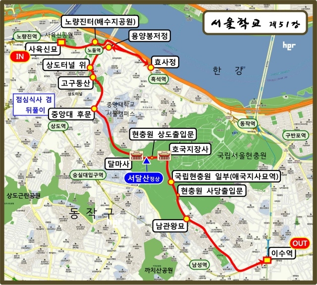사육신묘-노량진터(배수지공원)-효사정-용양봉저정-상도터널 위-고구동산-중앙대 후문-점심식사 겸 뒤풀이-달마사-서달산 정상-현충원 상도출입문-호국지장사-국립현충원 일부(애국지사묘역)-현충원 사당출입문-남관왕묘-이수역