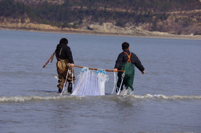길은 한운리에서 둔장리로 이어진다. 둔장리 삼거리에 서자 비로소 해변백사장이 보이기 시작한다. 둔장리 해변에서 할미섬까지는 긴 돌무더기가 쌓여있다. 독살이다. 독살은 돌그물이다. 바닷가에 돌담을 쌓아 밀물 때 들어온 물고기를 가두어 썰물 뒤 잡아들이는 함정어법이며 원시어로다. 둔장리 백사장은 거침없다. 티끌 하나 없이 맑은 해변. 해변의 솔숲 길은 사철포까지 이어진다. 둔장리 해변에서는 사내들 몇이 그물질을 하는 중이다. 몬치 그물질이다. 몬치는 작은 숭어를 이르는 이 지역 말이다. 여름에는 뻘 냄새가 나서 맛이 없는 숭어지만 겨울이면 최고의 맛을 자랑하는 것이 참숭어다. 그래서 일본에서는 겨울 참숭어를 천하 삼대 진미 중 하나로 꼽기까지 했었다.