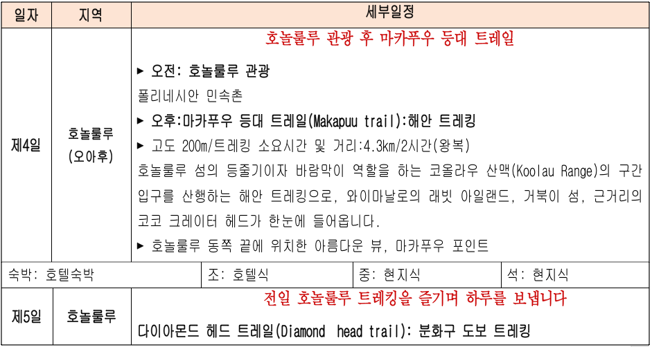 오아후 섬으로 돌아오면 가벼운 트레킹과 달콤한 휴식, 궁금증을 풀어주는 역사 탐방, 그리고 자유로운 방황이 기다립니다. 호놀룰루 해안에서 휴식의 시간을 갖기도 하고 화산분화구인 ‘다이아몬드 헤드 트레일’을 오르기도 합니다. 한나절 주요 명소 특히 ‘하와이 민속촌’을 방문해 하와이에 대한 이해의 시간도 갖습니다.