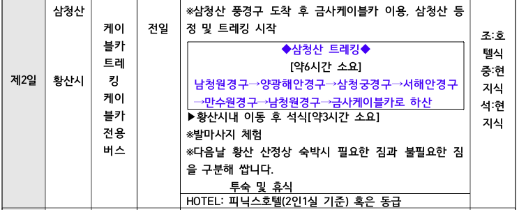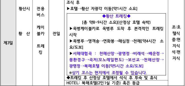 이번 황산·삼청산 트레킹 일정은 다음과 같습니다.