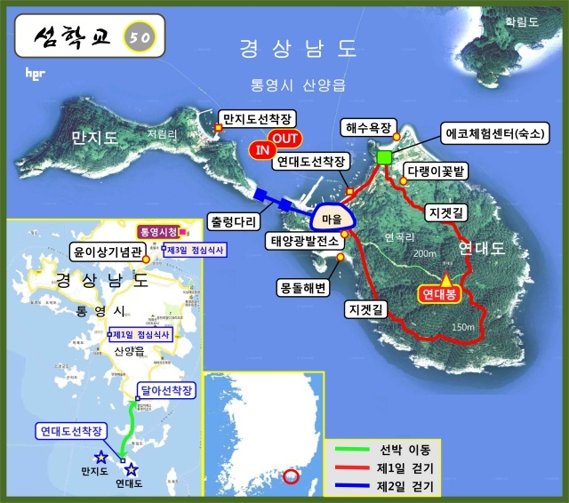 8월 섬학교(교장 강제윤. 시인, 섬여행가) 제50강은 에코아일랜드 연대도와 이웃 섬 만지도에서 8월 12일(금)부터 14일(일)까지 2박3일간 ‘여름휴가형’ 답사로 진행됩니다(8월 둘째 주말 연휴기간입니다). 숙소 바로 앞 산호빛 백사장이나 몽돌해변에서 물놀이도 하고 섬 둘레를 도는 ‘지갯길’도 걷고 출렁다리로 연결된 만지도까지 산책도 다녀옵니다. 따가운 한낮엔 낮잠이나 책읽기, 낚시 등을 할 수도 있습니다. 또 연대도 앞바다에서 막 건져 올린 참돔회와 섬 주민들이 직접 요리해주는 해산물 음식들은 섬 여행의 즐거움을 배가시켜 줄 것입니다. 시원하고 한가로운 섬에서의 휴가를 원하는 분들을 여름 통영 섬으로 초대합니다.