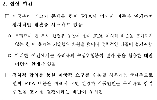 그런데 그 문구 위에는 '미국 측이 정치적 해결을 시도하고 있음'이라는 문구와 '정치적 합의를 통한 미국측 요구를 수용할 경우 국내적으로 한미 FTA 비준을 위해 국민 건강과 식품안전을 무시하고 검역주권을 포기한 결정이라는 비난이 우려된다'는 내용이 포함돼 있다.