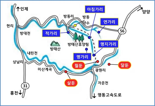 [3둔4가리] 3둔은 월둔, 살둔(생둔), 달둔, 4가리는 아침가리, 명지거리(가리), 연가리, 적가리를 말한다. '둔'은 산 속의 평평한 땅으로 사람이 살만한 곳이라는 의미고, '가리'는 소 한 마리가 하루에 갈 수 있는 단위인 '갈이(耕)'에서 온 것으로 보인다.