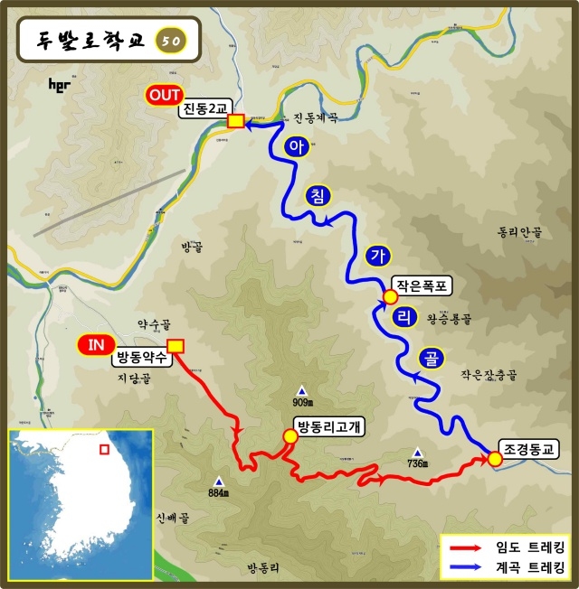 흐르는 물길 속을 걷기도 하고, 건너고 또 건너며 몸을 담그기도 하면서 계곡과 함께 흐르다 보면 진동1리에서 진동계곡의 방태천과 만나는데, 여기서 트레킹을 마칩니다. 서울로 오는 길, 유명 맛집에서 늦은 식사 겸 뒤풀이를 합니다(동동주, 감자전, 촌두부에 한우국밥/청국장/막국수 중 택일). 산행 약 5km, 계곡 약 6km, 도합 약 11km를 점심식사와 휴식시간 포함, 약 6시간 동안 걷습니다.
