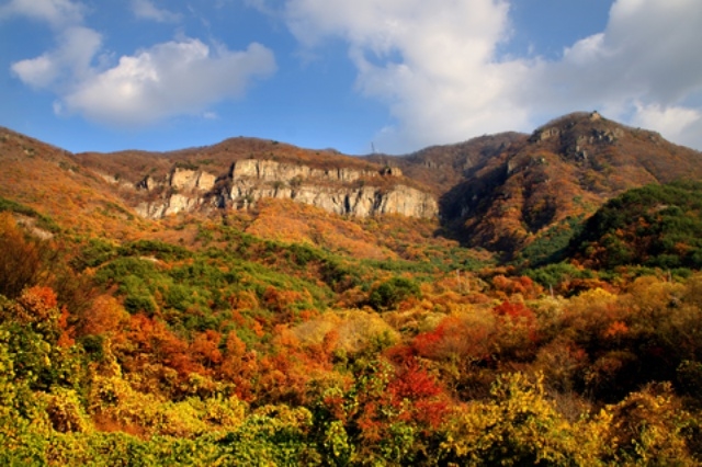 적상산(赤裳山. 1034m)은 사면이 층암절벽으로 둘러싸여 가을 단풍이 붉게 물들면 마치 여인들의 치마와 같다고 하여 ‘적상’이라 이름 붙였답니다. 정상의 기봉이 향로봉(1029m)을 거느리고 천일폭포, 송대폭포, 장도바위, 장군바위, 안렴대 등의 자연명소와 정상분지의 양수발전소 상부댐인 산정호수(적상호), 고색창연한 적상산성, 안국사 등 유서 깊은 문화유적을 간직하고 있습니다.
