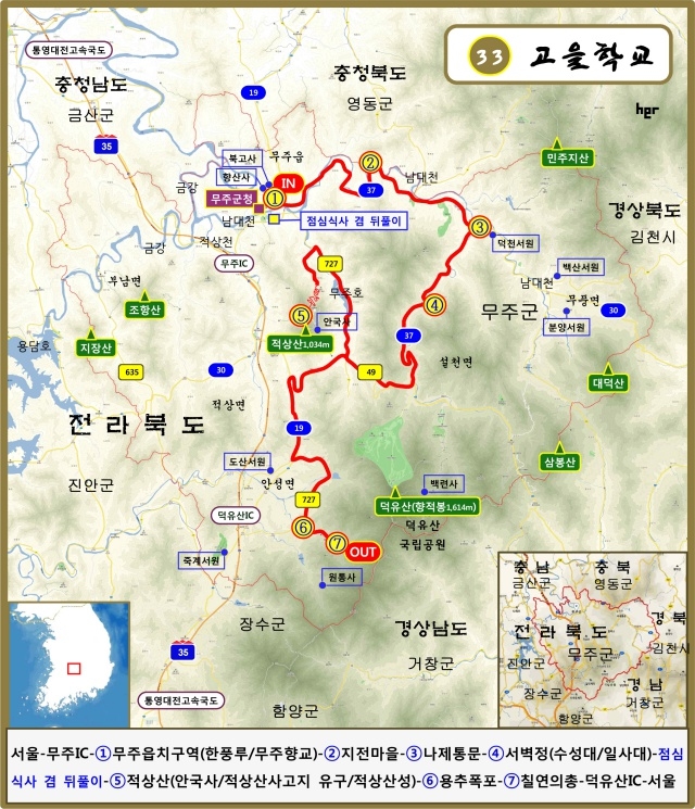 이날 답사 코스는 서울-무주IC-무주읍치구역(한풍루/무주향교)-지전마을-나제통문-서벽정(수성대/일사대)-점심식사 겸 뒤풀이-적상산(안국사/적상산사고지 유구/적상산성)-용추폭포-칠연의총-덕유산IC-서울의 순입니다.