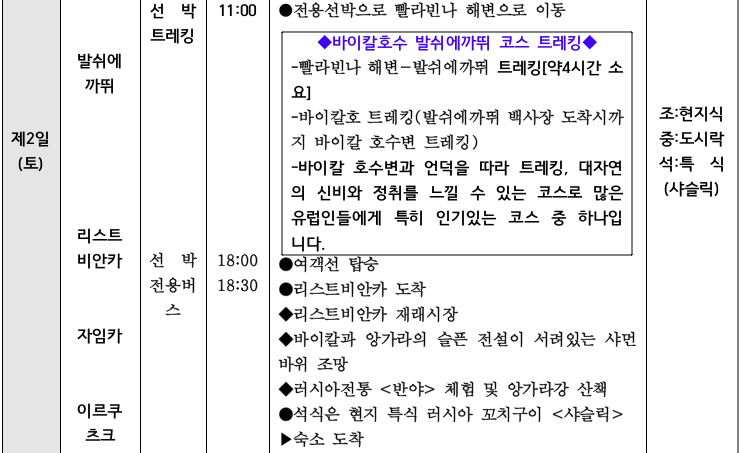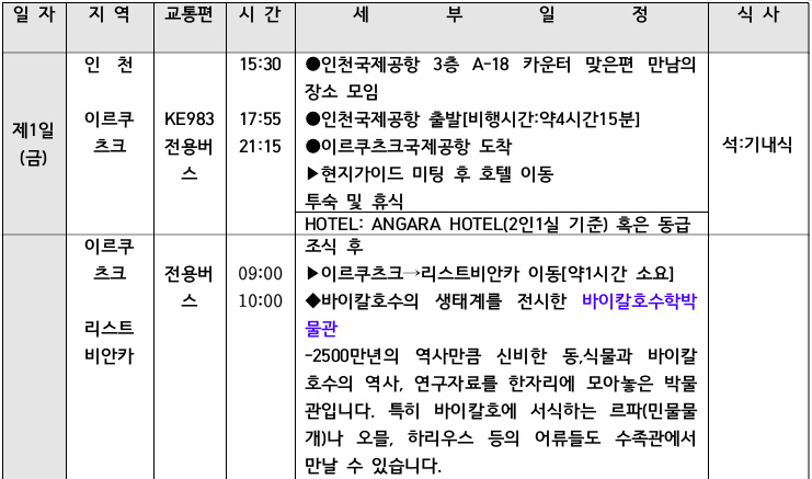 <바이칼캠프>(캠프장 김창원, 해외트레킹전문가)가 준비·진행하는 이번 <단풍바이칼> 답사의 자세한 일정은 다음과 같습니다.