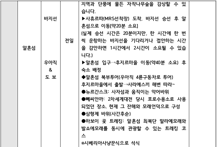 이르쿠츠크에서 버스편으로 약 4~5시간 걸립니다. 이동 중 부랴트족 성황당(우스찌아르다)과 광활한 시베리아 벌판의 스텝과 드넓은 가을들꽃 지역과 단풍으로 물든 자작나무숲을 감상할 수 있습니다. 사휴르따에서 바지선을 타고 알혼섬으로 들어갑니다. 4륜구동차 우아직을 타고 알혼섬 북부투어에 나섭니다. 뉴르간스크의 사자섬과 움직이는 악어바위, 삼형제바위를 보고 알혼섬 최북단 하보이곶 트레킹도 합니다. 시베리아 사냥꾼식으로 저녁식사를 한 후 야간별자리 보기와 캠프파이어로 알혼의 밤을 지새웁니다. 특별히 알혼섬은 사계절의 별을 한꺼번에 볼 수 있어 별자리 보기의 명소이기도 합니다.