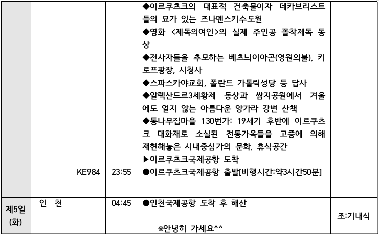 마지막 날, 이르쿠츠크국제공항을 떠나 인천으로 향함으로써 4박 5일간의 아름다운 바이칼 환상체험 답사를 마칩니다. 단풍과 들꽃의 계절, 당신의 고단한 심신을 바이칼에 풍덩 던져 새로운 기운과 정신을 가득 길어오는 여행길이 되시기 바랍니다.