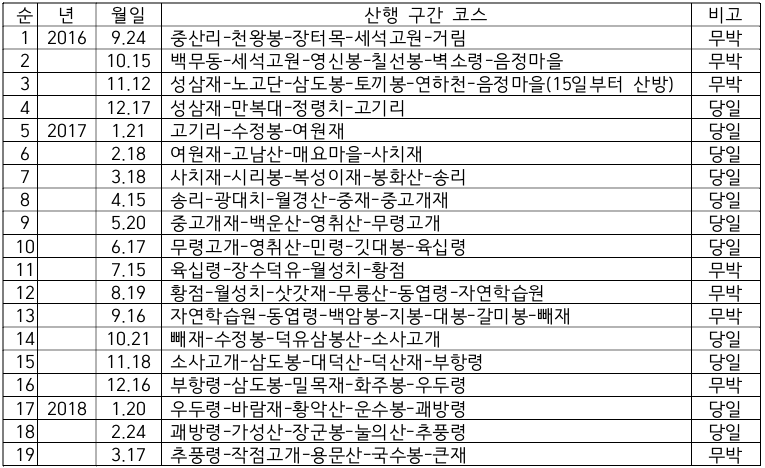 [백두대간 종주 전체 일정(매월 셋째 주 토요일 기준)]