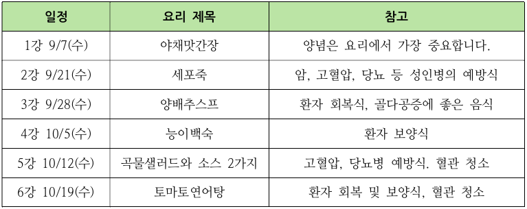 오는 9월 자연건강요리학교를 엽니다. 자연건강요리학교는 질병 예방과 건강 증진을 목적으로 합니다. 자연건강식 요리교육을 통해 건강에 도움을 주고자 합니다. 100세 시대에 혈관을 깨끗하게 하는 요리학교입니다.