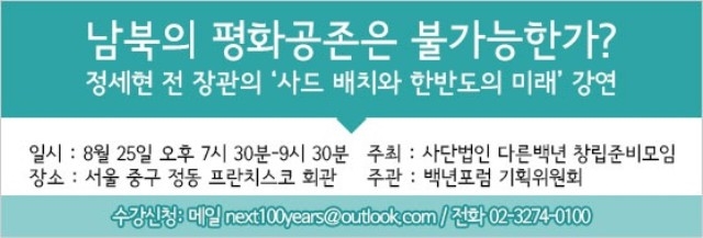 민족적 차원의 각성과 대토론이 필요한 때입니다. 이에 (사)다른백년은 정세현 전 통일부 장관을 모시고 '남북의 평화 공존은 불가능한가? : 사드 배치와 한반도의 미래'를 주제로 8월 백년포럼을 열려 합니다.