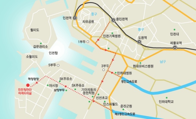 -대중교통안내 : 서울지하철 1호선 서울역에서 동인천역까지 약 1시간10분 소요. 1번출구로 나와 연안부두까지 택시로 약 20분 걸림. 장거리이므로 충분한 여유시간을 갖고 오시기 바랍니다. 용산역에서 구로역 사이에서 동인천역 급행을 타시면 시간을 단축할 수 있습니다.