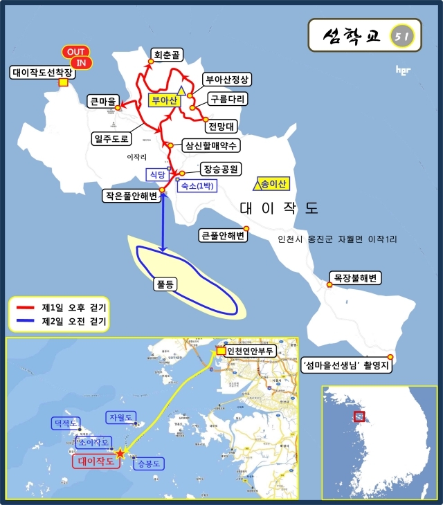 대이작도는 이름처럼 큰 섬이 아닙니다. 큰 ‘대’자가 붙은 것은 소이작도에 비해 크다는 뜻일 뿐, 섬은 면적 2.57㎢, 해안선 둘레 18km의 작은 섬입니다. 대이작도의 선착장에는 ‘영화의 섬’이라는 빛바랜 글귀가 눈에 띕니다. 대이작도는 이미자의 노래 <섬마을선생님>을 영화화한 <섬마을선생님>(1967년 김기덕 감독 작품)의 배경이 됐던 섬입니다. 나그네는 선착장을 지나 큰말 부근에서 대이작도 부아산에 오릅니다. 해발 159m의 부아산. 산정에는 구름다리도 놓여 있습니다. 정상에 오르니 대이작도 주변의 섬들이 발아랜 듯 가깝습니다. 동쪽은 옹진군의 승봉도, 서북쪽은 자월도, 소야도, 덕적도, 서쪽은 문갑도, 굴업도, 각흘도, 남서쪽은 선갑도, 백아도, 울도. 동남쪽으로는 풍도, 육도, 대란지도 등 충남의 섬들도 지척입니다.