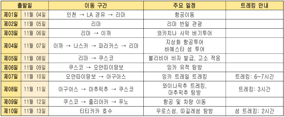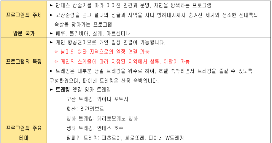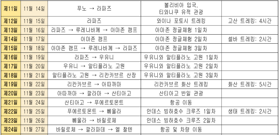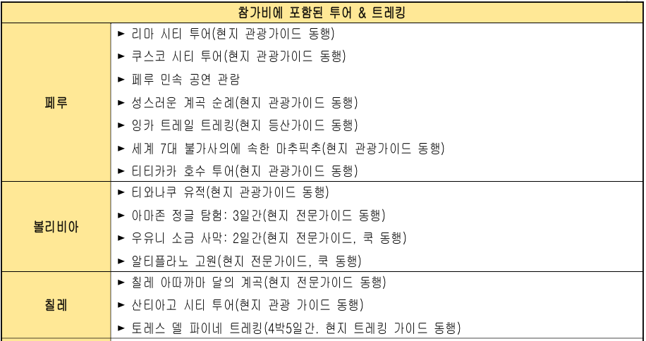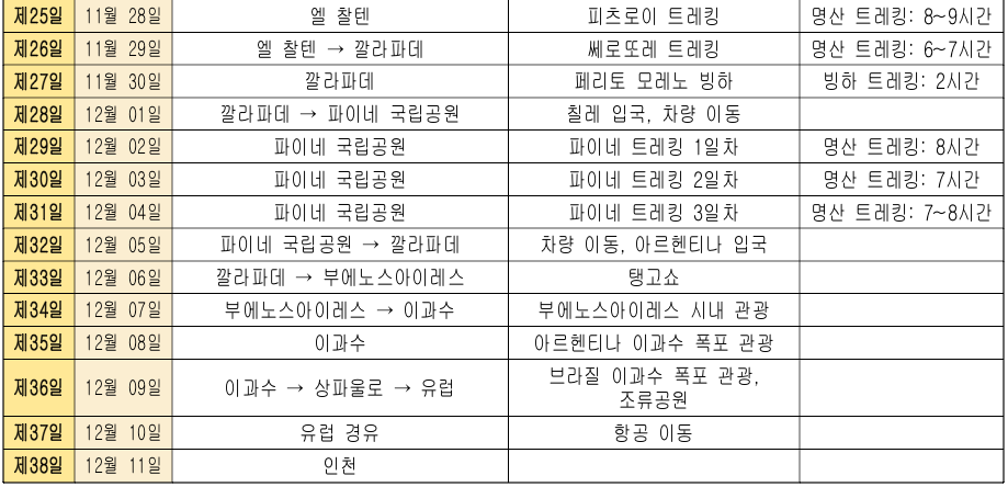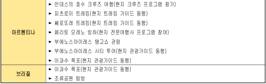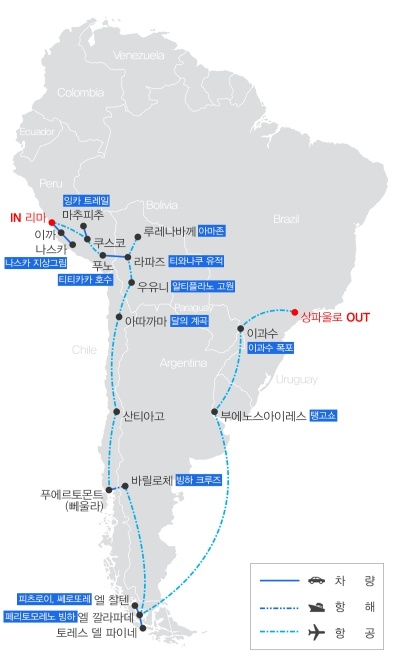 ▷38일의 긴 스케줄이 어려운 분들을 위해 몇 곳에서 IN-OUT을 할 수 있게 구성하였습니다. IN–OUT이 가능한 지역 : 리마, 산티아고, 깔라파데, 부에노스아이레스