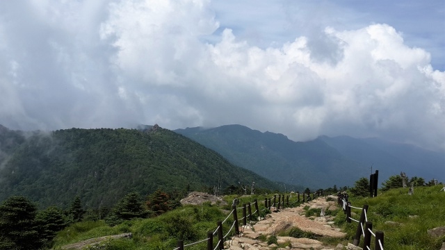 로타리대피소에서 아침식사를 한 후 우리나라에서 가장 높은 곳에 위치한 사찰 법계사를 지납니다. 철계단이 이어져 있고 넓은 바위를 지나 개천문으로 향합니다.