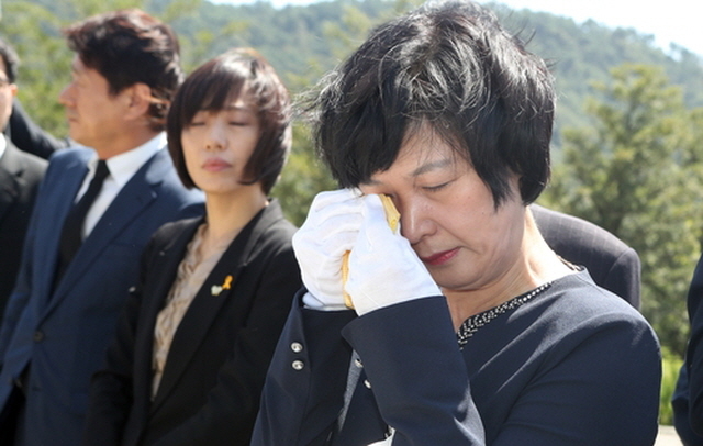 ▲ 더불어민주당 추미애 대표가 31일 경남 김해시 진영읍 봉하마을 노무현 전 대통령 묘소에서 눈물을 흘리고 있다. ⓒ연합뉴스