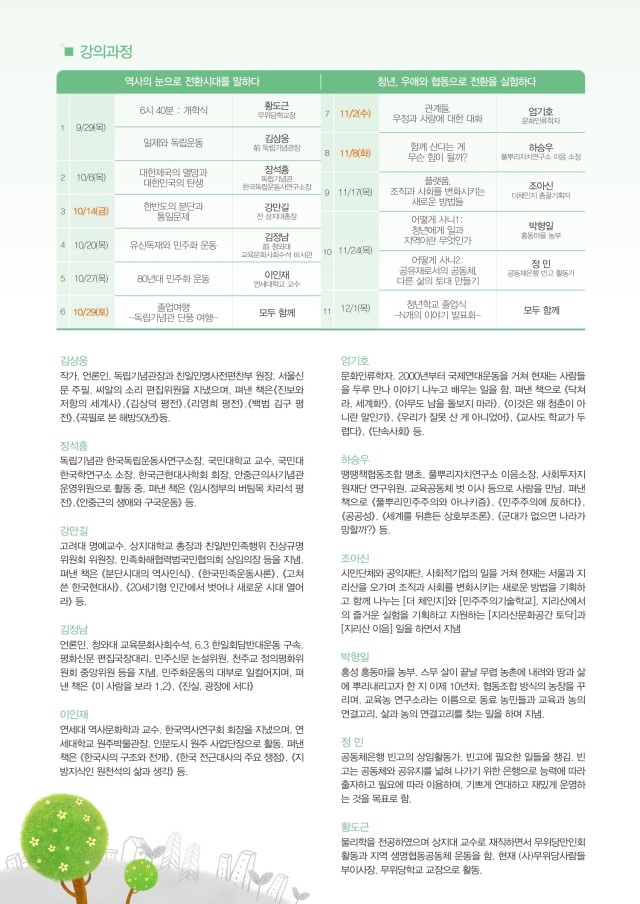 강연은 무의당학교장 황도근, 전 독립기념관장 김상웅, 한국독립운동사연구소장 장석흥, 전 상지대 총장 강만길, 전 청와대 교육문화사회수석 김정남, 연세대 교수 이인재 등 석학뿐 아니라, 문화인류학자 엄기호, 풀뿌리자치연구소 이음 소장 하승우, 더체인지 총괄기획자 조아신, 홍동마을 농부 박형일, 공동체은행 빈고 활동가 정민 등 지식인과 현장 경험자가 함께한다.