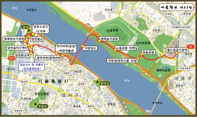 월드컵경기장역-하늘공원-전망대(양천고을 조망)-노을공원 아랫길-생태습지공원-가양대교-광주바위(광제바위)-허가바위(공암)-허준기념관-점심식사 겸 뒤풀이(<양천골해정갱>에서 야채전, 막걸리에 양반효종갱 또는 황태해장국)-양천읍치구역터-겸재기념관-양천고성지-소악루-양천향교-양천향교역