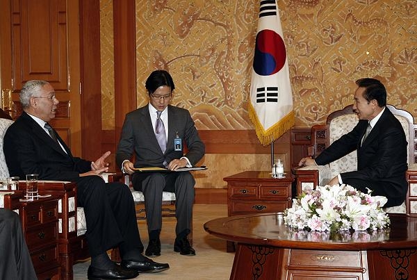 이 대통령은 또 "파월 전 장관께서 앞으로 한미관계 발전을 위해 많이 협력해 달라"고 당부했고, 파월 전 장관은 "한미 양국의 지속적인 발전과 교류증진을 위해 제가 할 수 있는 최선의 노력을 다 하겠다"고 화답했다.