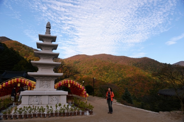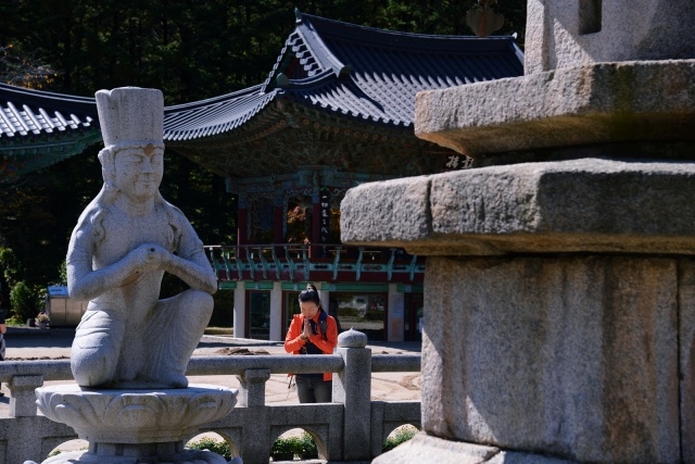 월정사는 643년 자장율사가 창건한 천년고찰이지만, 6·25전쟁 때 깡그리 불타 오래된 건물이 없습니다. 다행히 적광전 앞에 서 있는 팔각구층석탑이 남았습니다. 탑 앞에는 두 손을 모아 쥐고 공양하는 자세로 무릎을 꿇은 석조보살좌상이 있는데, 살짝 미소 짓는 모습이 매력적입니다.