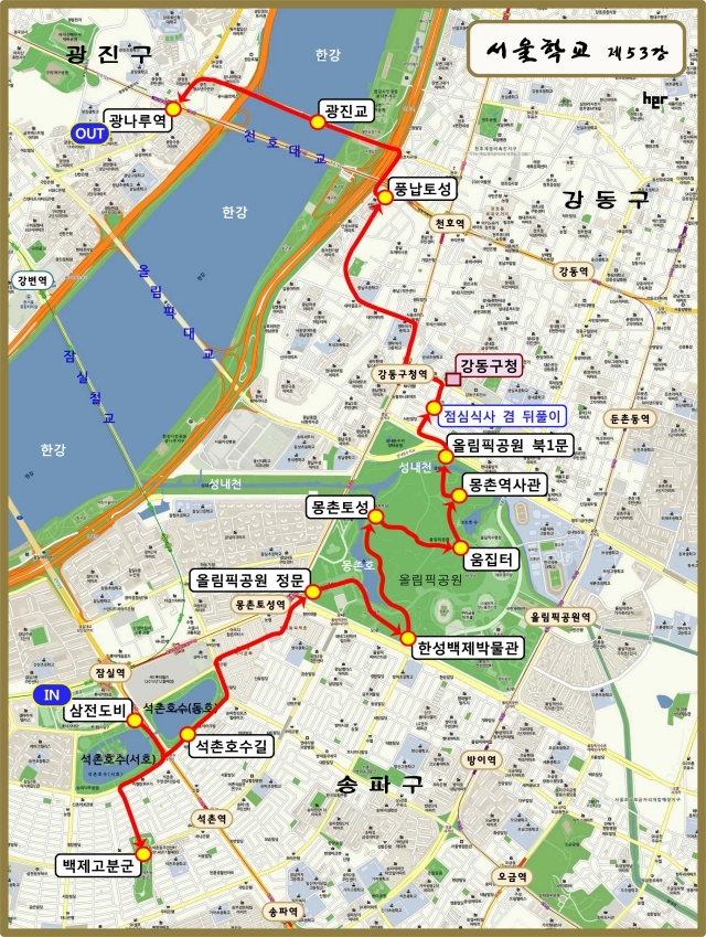 삼전도비-백제고분군-석촌호수길-올림픽공원 정문-한성백제 박물관-몽촌토성-움집터-몽촌 역사관-올림픽공원 북1문-강동구청 앞-점심식사 겸 뒤풀이(하늘빛우렁쌈밥)-풍납토성-광진교-광나루역