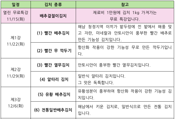 이번 <특별한 김치교실>의 특징은 ▶100% 핸드메이드 ▶100% 우리 농산물 ▶해남 청정지역에서 재배한 김치재료 ▶식품첨가물 No! ▶항산화 명품김치입니다.