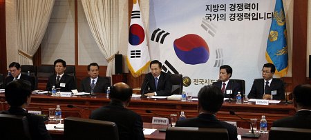 | ▲ 이명박 대통령이 4일 오후 16개 시도지사들을 청와대로 불러 간담회를 열고 있다. ⓒ청와대 |