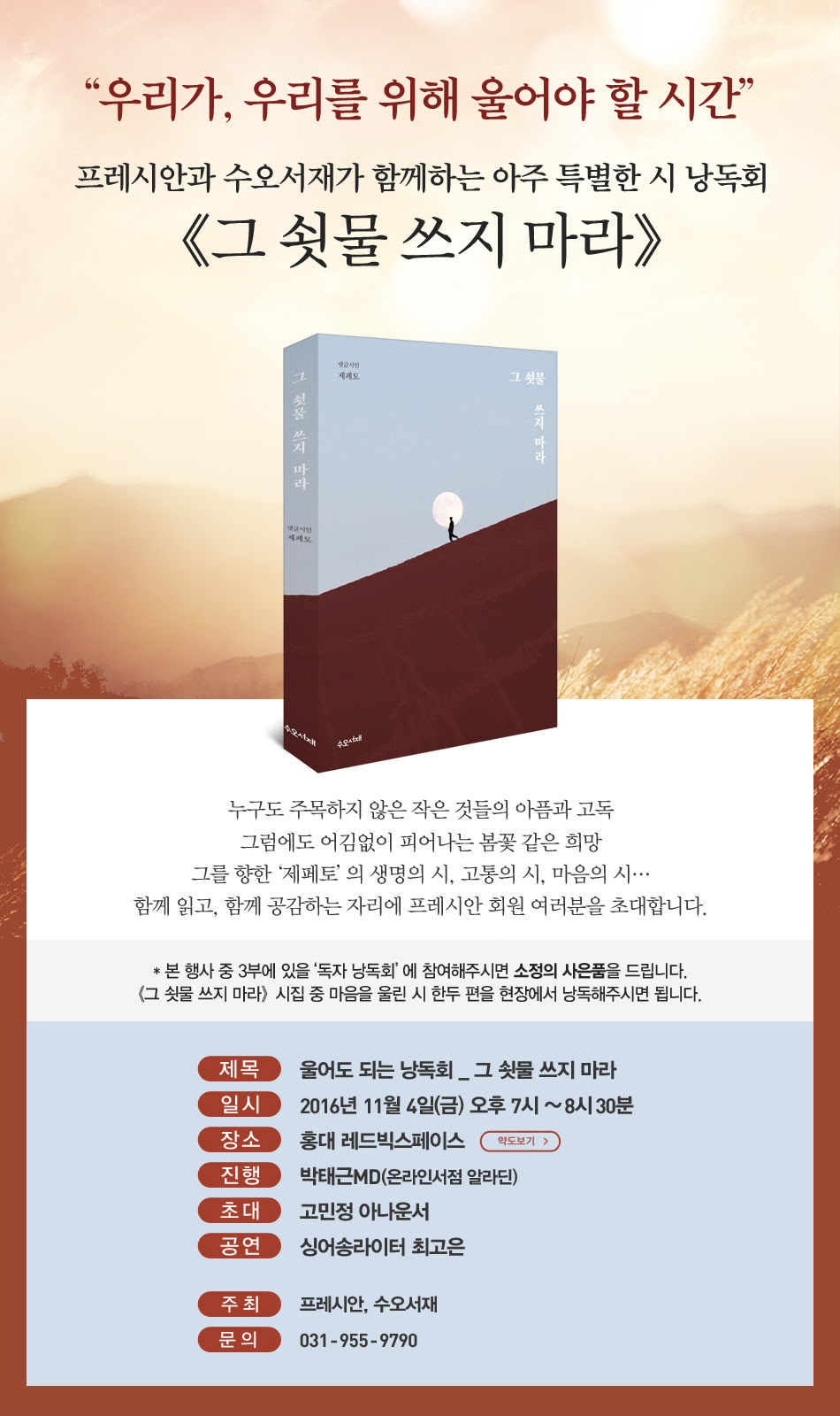 프레시안은 <그 쇳물 쓰지 마라> 시집 낭독회를 출판사 수오서재와 함께 진행합니다. 11월 4일 오후 7시 홍대 레드빅스페이스에서 열리는 이번 행사는 박태근 온라인서점 알라딘 MD가 진행하고 고민정 아나운서를 이야기손님으로 초대했습니다. 싱어송라이터 최고은 씨의 공연도 준비되어 있습니다. 많은 분들이 참여해 주시길 바랍니다.