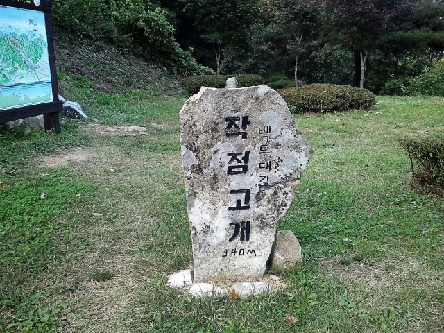 [사기점고개] 390m. 고개 남쪽의 김천시 봉산면 사기점리는 옛날 사기를 구워냈던 가마가 있던 마을이었다고 한다. 사기점고개라 칭한 이유를 알 것 같다. 사기점고개 북쪽 너머는 영동군 추풍령면의 작점리이다.