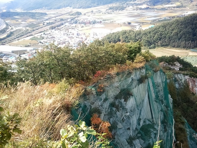 385m의 반쪽이 잘려진 금산입니다. 파란 철망을 씌운 금산의 절개지는 아찔합니다. 처참합니다. 마음이 아립니다. 정말 가슴 아픈 훼손의 현장입니다.