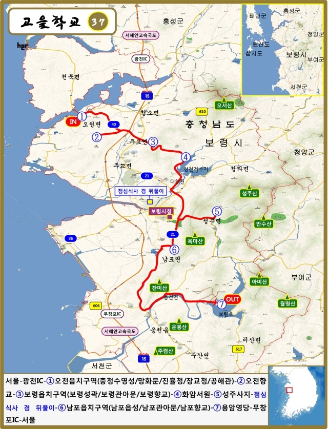 이날 답사 코스는 서울-광천IC-오천읍치구역(충청수영성/망화문/진휼청/장교청/공해관)-오천향교-보령읍치구역(보령성곽/보령관아문/보령향교)-화암서원-점심식사 겸 뒤풀이-성주사지-남포읍치구역(남포읍성/남포관아문/남포향교)-용암영당-무창포IC-서울의 순입니다.