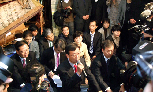 | ▲ 지난 18일 외통위 회의장 앞에서 민주당과 민노당 의원들이 함께 연좌하고 있는 모습ⓒ프레시안 |