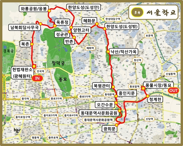 헌법재판소(광혜원터)-북촌-남북회담사무국-옥류정-와룡공원-응봉-한양도성(도성안)-양현고터-성균관-반촌-혜화문-점심식사 겸 뒤풀이-한양도성(도성밖)-낙산-적산가옥-북평관터-흥인지문-오간수문-동대문역사문화공원-광희문-청계천-풍물시장-동묘