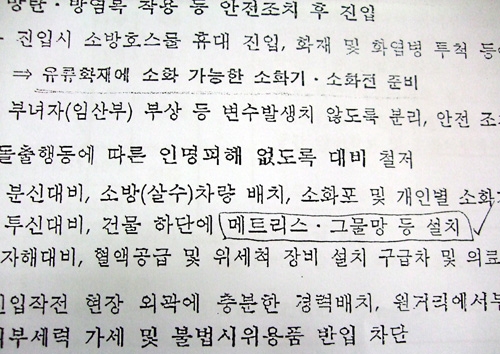 또 "소방차 6대, 소방 고가 사다리차 2대, 바스켓차 2대 반드시 확보"라는 구절도 있지만 사건 현장 가까이에는 고가 사다리차가 배치되지 않았다.