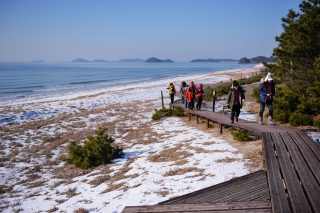 드르니항과 마주한 백사장항은 아담하고 정겨운 항구입니다. 이곳에서 잡히는 대하가 유명해 10월이면 축제가 열립니다. 백사장항 해산물센터를 지나면 솔숲이 나오면서 노을길이 시작됩니다. 노을길은 바다를 따르기에 평탄한 길이라고 생각하기 쉽지만, 발이 푹푹 빠지는 모래언덕과 비탈진 산길도 제법 많습니다.