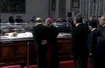 | ▲ 전두환 전 대통령이 뒷짐을 진 채 김수환 추기경의 시신이 안치된 유리관 안을 들여다 보고 있다. ⓒYTN 화면캡처. |