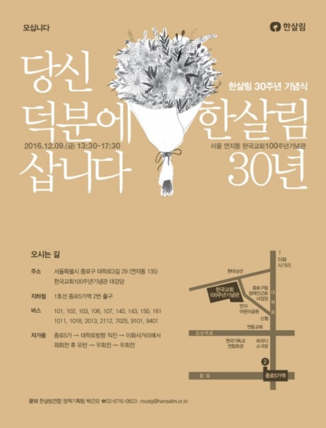 기념식은 박원순 서울시장, 김성훈 전 농림부 장관, 유키오카 요시하루 일본 그린코프공동체 고문의 축사를 시작으로, 조합원과 생산자의 활동상을 담은 다큐멘터리 영화 <잘 왔다. 우리 같이 살자>가 상영된다. 고(故) 인농 박재일 선생과 고(故) 무위당 장일순 선생을 비롯한 조합원·생산자·실무자 공로상 수여와 '한살림 이야기 공모전' 수상작에 대한 시상이 이뤄진다.