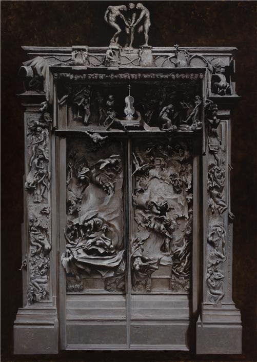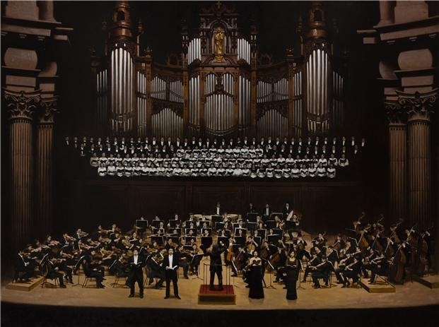 베토벤의 <합창>, 라흐마니노프의 <피아노 협주곡>은 무대 위 연주자들, 악기, 파이프오르간, 샹들리에 조명 등을 캔버스 위에 사실적으로 조화롭게 배치시켰습니다. 모차르트의 <레퀴엠>, 파가니니의 <바이올린 연주>는 각 음악의 특징을 살려 중세 성당의 빛, 단테의 <지옥의 문>에 내려앉은 바이올린을 통해 음악을 작품 속에 고스란히 담아내고 있습니다. 이 대표적인 작품들은 대형 캔버스(250×190cm)에 담겨 있어, 각 곡들의 웅장함이나 연주자의 열기를 고스란히 느낄 수 있는 특별한 경험을 선사할 것입니다.