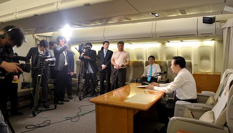 | ▲ 지난 7일 귀국행 특별기에서 라디오 연설 녹음을 진행하고 있는 이명박 대통령. ⓒ청와대 |