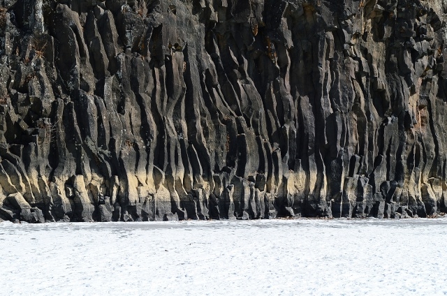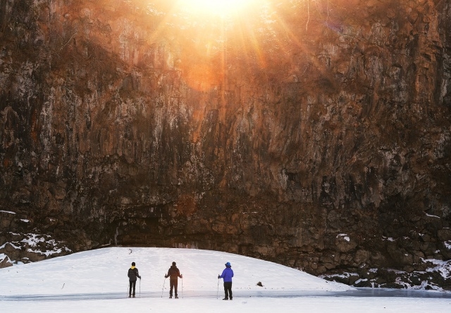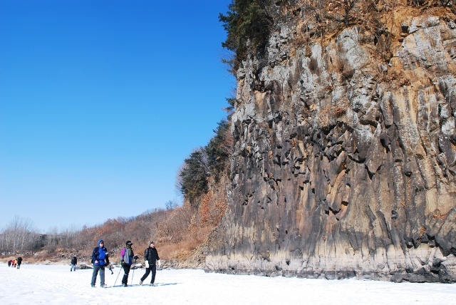 높이 20m가 넘는 주상절리 절벽이 양쪽으로 병풍처럼 둘러싸고 있다. 그 모습이 영락없이 제주도 대포동 주상절리와 닮았다. 주상절리 아래를 자세히 보면, 희끗희끗한 곳이 보인다. 그곳은 여름철이면 강물 안으로 잠기는 부분이다. 그 반대편에는 주상절리 폭포가 펼쳐져 있다. 물줄기가 꽁꽁 얼어 거대한 기둥을 만들었는데, 얼음과 절벽의 형상이 마치 태초의 시간처럼 아득하다.