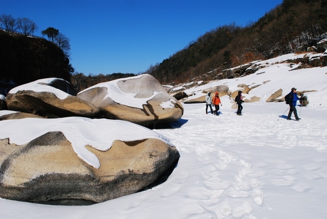송대소를 지나면 강 가운데를 흐르는 강물이 보인다. 반갑다. 그동안 눈이 덮인 탓에 강인지, 산인지 구별이 안 됐다. 이어지는 화강암 너럭바위 지대. 용암이 땅속을 나와 흐르다가 굳은 것이 현무암이고, 화강암은 용암이 땅 밖으로 나오지 않고 속에서 그대로 굳은 것이다. 현무암이 거칠다면, 화강암은 표면이 반질반질해서 예쁘다. 넓적한 화강암들이 쌓인 마당바위를 지나면 바위들이 둥그렇게 둘러싼 곳이 나온다. 이곳이 점심 먹기 좋은 장소다. 차가운 얼음 바닥에서 후후~ 입김 불어가며 먹는 라면 맛을 어떻게 말로 표현할 수 있을까.