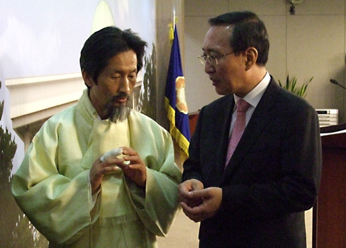 | ▲ 14일 오후 다른 문제로 만난 양당 대표가 울산 단일화 문제를 논의하고 있다 ⓒ프레시안 |