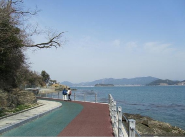 평지가 드문 통영에서 삼칭이해안길은 더없이 걷기 좋은 평탄한 길입니다. 해안 침식을 막기 위해 쌓은 제방에 길을 낸 것이 통영 최고의 해변길이 됐습니다. 마리나리조트에서 영운리까지 4km를 내내 바다만 보며 편안히 걸을 수 있습니다. 이 길은 자전거도로로 만들어진 까닭에 시멘트 포장을 했습니다. 흙길이 아니라 조금 아쉽지만 시리도록 푸른 청보석의 바다는 그런 아쉬움쯤 잊게 해주기에 충분합니다. 무엇보다 자동차가 다니지 않으니 안전하게 걸을 수 있어서 좋습니다. 모처럼 삼칭이길을 걷습니다.